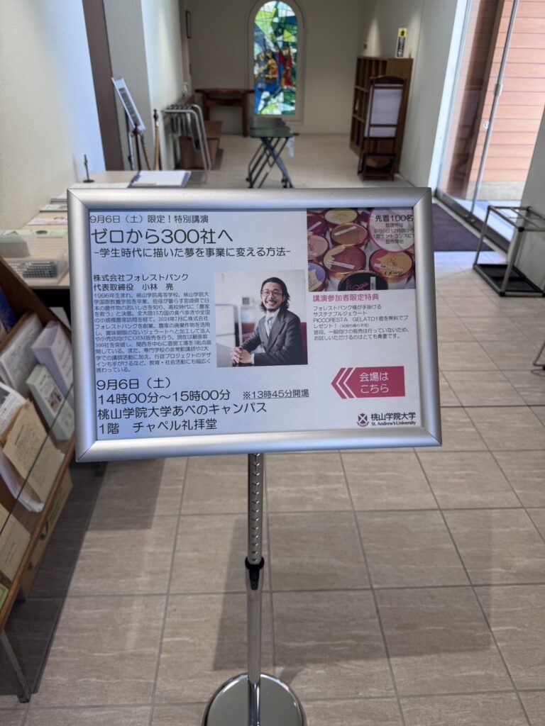 2025年9月6日に桃山学院大学にて開催されたイベントにて、弊社代表が登壇し、ジェラート事業や地域資源を活かした取り組みについて講演を行いました。